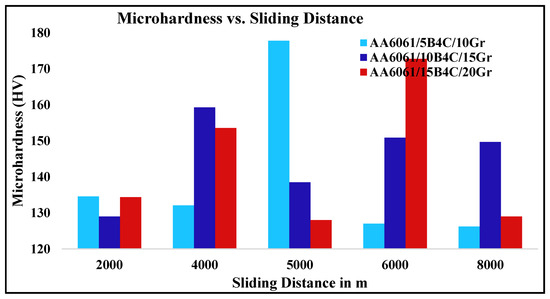 The microhardness of AA6061/B4C/Gr composites increased as the sliding distance increased up to 5000 m. After that, it decreased and stabilized after reaching 6000 m [27]. This behavior change was attributed to strain hardening initially, followed by softening due to wear and the accumulation of reinforcement debris. Creating a transfer layer on the worn surface, also known as the mechanically mixed layer, was responsible for this effect as it enhanced the microhardness values. However, when the sliding distance increased, the MML got saturated, causing the microhardness levels to stabilize.