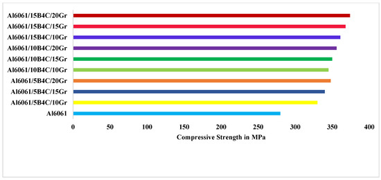 Figure 5 illustrates the UCS of AA6061 with reinforced materials Gr and B4C and the UCS value of AA with nine weight percent of supporting materials. Increasing the weight percentage of reinforced material raises the MMC’s UCS. Since HCs are superior to the base alloy, high UCS values were observed with 20% Gr and B4C—5%, 10%, and 15% of the reinforcement components with AA6061 matrix [33]. Furthermore, increasing the weight percent of Gr leads to a larger granule size, generating a large dislocation population in the AA matrix and a high compression capacity of AA HCs (Figure 5). AA-Gr and B4C fine-sized ceramics are more complex than the matrix, resulting in excellent compression stability. As a result, the strong ceramic particulate materials can withstand deformation while enhancing AA strength [37,39,41].
