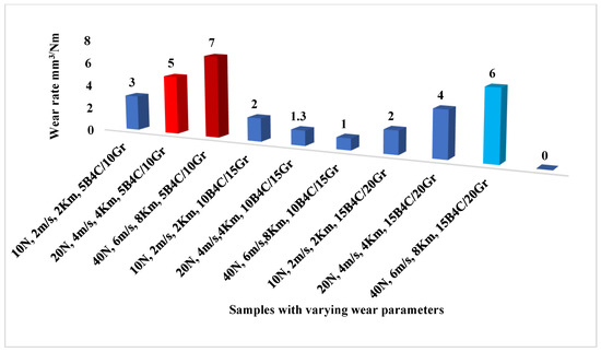 Adding B4C ceramic with Gr substance and to aluminum-based MM composites (MMC) through SCP increased microhardness and decreased weight loss (WL) as the concentrations of B4C and graphite increased. The maximum wear resistance was observed at 15 wt.% B4C and 10 wt.% Gr [25]. Response surface analysis (RSM) and artificial neural network (ANN) were utilized to evaluate the tests’ impact and determine their significance level. The Taguchi model, in conjunction with an ANN, was employed to ascertain the wear behavior of the hybridized mixture and estimate the influential factors on the degradation rate of composites [26]. While data are scarce regarding the effects of dry sliding wear on multi-ceramic reinforced composites, the findings from this study will contribute to defining the role of hybridized composites (AA6061 + B4C + Gr) in functional settings [27,28]. The addition of Gr particles to aluminum alloys significantly enhances wear resistance and reduces the coefficient of friction.