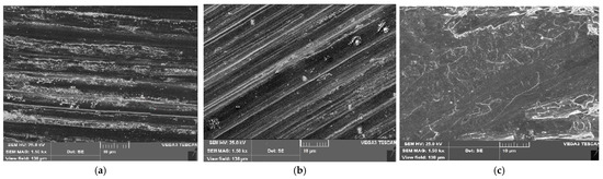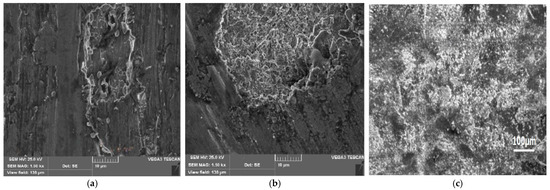 Micrographs of the worn surfaces of the HCs, as shown in Figure 7a–c, after applying an applied average axial load (ANL) of 30 N at a sliding distance of 2000 m and a sliding speed of 3 m/s, exhibited adhesive wear. The wear behavior of AA and HCs under various loads is observed, with the worn pin surface of the AA displaying more debris. In contrast, the abraded wear surfaces displayed coarse and deep grooves in the sliding direction. The application of load enhances the production of coarse grooves, wear debris, and surface delamination. Significant plastic stresses were directly applied to the pin’s surface, and the harsh asperities on the steel counter face plowed or cut into the pin, generating wear by removing tiny pieces of matrix material [33,45,46,47,48].