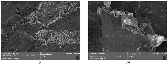 When conducting the wear test on the AA/5B4C/10Gr HC, fine and shallow grooves were observed in the sliding direction with tiny debris at a load of 10 N. The incorporation of strong B4C reinforcement resulted in reduced groove width and debris development, leading to lower wear rates (WRs). The composite’s load-bearing capacity improvements also enhanced abrasion resistance, lowering WR. However, when the applied axial load was increased to 20 N, delamination became the dominant characteristic due to subsurface plastic deformation and the creation of subsurface crack propagation. Alongside broader grooves, a more significant amount of debris was also observed. The stress caused by repetitive sliding on inclusions or other flaws in the aluminum alloy leads to the nucleation of subsurface fractures, which eventually spread parallel to the surface and reach the surface. Generating long and thin flake-like sheets or plate-like debris, as shown in Figure 8a,b.