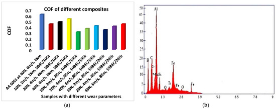 The coefficients of friction (COF) of composites and unreinforced alloys were calculated in order to evaluate their friction behavior. Figure 12a shows that as the applied load grew, so did the COF of the AA and their HCs. As the load rises due to wear, debris accumulation increases, which may affect the true area of contact and hence the COF. This might be because the dry sliding wear testing employed a larger load range and sliding speed. With the addition of Gr particles, the COF in AA6061 alloy dropped, reaching a minimum at 15% Gr content. This is twice as cheap as the basic alloy. The addition of 15% Gr to the basal matrix material has no discernible effect on the COF. The lubricating layer thickness and Gr content both rise, lowering the COF and reducing shear stress at the subsurface. The composite has better tribological properties than the matrix alloy, keeping the wear rate and COF low at an acceptable Gr content. The existence of a smeared graphite layer at the tribosurface, serving as a solid lubricant, can be attributed to the lower COF. As the B4C percentage is increased, the COF lowers until it reaches a minimum value for 10% of the AA6061 alloy. The COF rises with further B4C addition as a result of the composite developing a thicker MML. Figure 12b illustrates the EDS results of the worn-out face where element Gr is missing, indicating that it might have changed phase (lubricant).