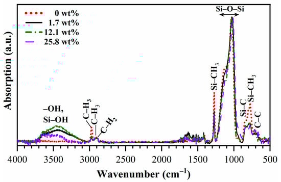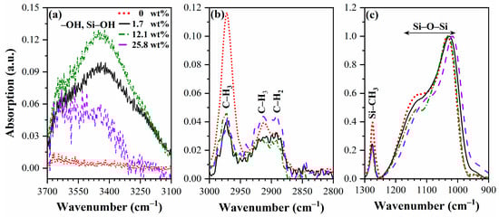 The FTIR spectra of fully cured (porosity-25%, pore size-1.04 nm) Eu-doped (0–25.8 wt%) OSG films are shown in Figure 2 and Figure 3. The observed absorption bands correspond to hydroxyl and silanol groups and adsorbed water (3700–3000 cm−1), hydrocarbons (3000–2800 cm−1), Si–CH3 (1300–1250 cm−1)) and Si–O–Si (1250–1000 cm−1) [25]. The pristine films (0 wt% Eu) almost do not show the presence of Si–OH and adsorbed water at 3700–3000 cm−1 (Figure 2 and Figure 3a). The introduction of Eu decreased the concentration of the CH3 group (3000–2950 cm−1) and Si–CH3 groups (1300–1250 cm−1) (Figure 2 and Figure 3b,c). As expected, in accordance with extensive previous experience [15,16], a reduction in the concentration of CH3 groups resulted in increased hydrophilicity of the films. In instances involving porous films, the inner pore surfaces become more hydrophilic, and the presence of condensed water molecules is discerned through the application of FTIR spectroscopy. The reduction in the concentration of CH3 (and Si–CH3) groups primarily occurred in the films deposited with 1.7 wt% of Eu(NO3)3·6H2O. Further increases in Eu concentration showed insignificant effects. It is observed that the highest hydrophilicity (highest amount of adsorbed water) corresponds to a moderate Eu concentration of 12.1%. Conversely, the film doped with 25.8 wt% of Eu(NO3)3·6H2O adsorbed less water molecules than both the 1.7 wt% and 12.1 wt% Eu-doped films. Additionally, there are less pronounced features, including an increase in the concentration of CH2 groups in the sample doped with 25.8 wt% of Eu(NO3)3·6H2O (Figure 3b, region 2850–2930 cm−1, which may suggest detachment of some of the hydrogen atoms from CH3 groups or reflect the formation of hydrocarbon residues [26]). A slight red shift in the Si–O–Si peak is also observed (Figure 3c).