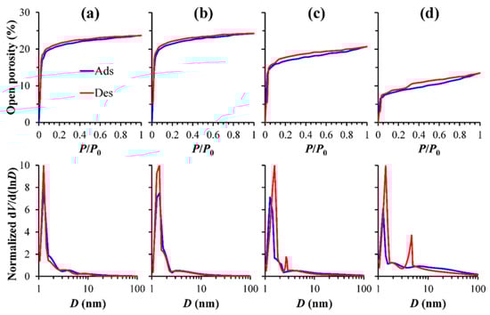 In this work, the EP system used a SENpro spectroscopic ellipsometer with SpectraRay/4 software for data analysis (SENTECH, Berlin, Germany) with λ = 350–850 nm. Atmospheric pressure ellipsometric porosimetry was used to evaluate the porosity and pore size distribution [23,24]. The angle of light incidence was fixed at 70°. Heptane vapor diluted by N2 carrier gas was used as an adsorptive. The open porosities of the films were calculated as the volume of condensed liquid adsorptive (V) from the RI values measured during the heptane adsorption by using the Lorentz–Lorenz equation. The calculation of the pore size of the mesoporous film was based on the Kelvin equation. The size of the micropores was calculated by using the Dubinin–Radushkevich equation adapted for EP [21].