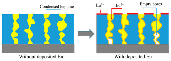 In the pristine film (left), the full porosity is equal to the open porosity (Table 1) because all the pores are interconnected for heptane adsorption. However, after Eu deposition, some parts of the pores become inaccessible to heptane adsorption (parts of 1 and 4 pores). This reduces the measured open porosity while the full porosity remains the same as in the pristine film.