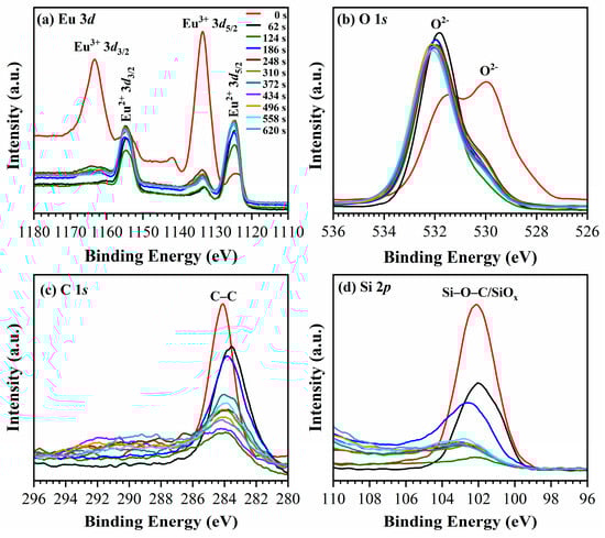 The XPS spectra show the comparison between the 25.8 wt% Eu-doped nanoporous OSG film (20 wt% Brij30 sample) deposited on a Si substrate (red curve) and the film after undergoing stepped ion beam etching for a duration ranging from 62 to 620 s.