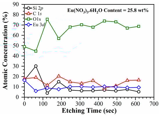 The atomic concentration profile of the components in the 25.8 wt% Eu-doped nanoporous OSG films plotted as a function of ion-beam etching time.