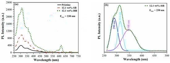 The photoluminescence spectra of 0 wt% Eu (pristine) and 12.1 wt% Eu-doped soft bake (SB) and hard bake (HB) nanoporous OSG films are shown in Figure 8. The pristine sample (fully cured) shows a single PL peak located near 300 nm (4.2 eV), which is related to the presence of a methyl terminal group and a carbon residue [34]. Thermal curing enhances the intensity of photoluminescence and broadens the emission spectra. Furthermore, in the PL region, the peaks display a duplicated structure, characterized by distinct peaks around 290 nm, 314 nm and 348 nm (Figure 8b). The peak at 290 nm coincides with the matrix luminescence. One notable characteristic is that in all previous publications discussing luminescence from SiO2 and SiOC materials doped with Eu2+, the PL peaks were consistently found at longer wavelengths, typically within the range of 400–500 nm.