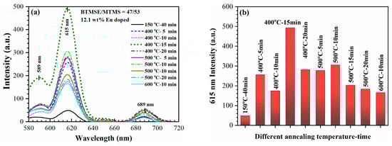 (a) Dependence of the PL intensity of Eu3+ (580–720 nm) on annealing temperature for 12.1 wt% Eu-doped films and (b) the dependence of the maximum PL intensity at 615 nm for different annealing temperature-time.