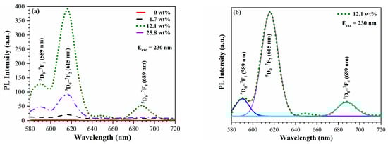 (a) Eu3+ photoluminescence intensity for different Eu(NO3)3·6H2O concentrations in the precursor Sol (wt%) upon excitation with light of 230 nm. (b) Deconvolution of the PL spectra of the sample deposited with 12.1 wt% of Eu(NO3)3·6H2O to peaks corresponding to well-known 5D–7F transitions in Eu3+.
