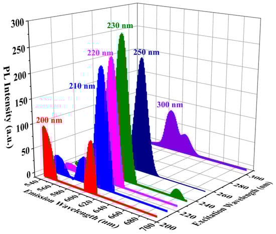 Dependence of PL intensity on wavelength of excited UV light. The maximum PL intensity is observed at 230 nm excitation wavelength.