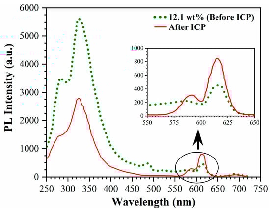 Figure 10 also shows that the PL intensity in this region depends on the Eu concentration. First it increases with an Eu concentration 0–12.1 wt%, then drops at 25.8 wt%. It is known that a high concentration of Eu doping reduces the distance between Eu ions, stimulating the non-radiative relaxation process and leading to cross relaxation between neighbouring Eu ions, which results in a decrease in luminescence efficiency [43,44]. Practical fluorescence quenching, caused by the aggregation of Eu3+, becomes evident in silica glass when the Eu content exceeds 1% (molar ratio) [45]. In our study, fluorescence quenching occurs at a higher Eu concentration due to the significantly larger internal surface area of mesoporous organosilicate films. Figure 11 demonstrates the dependence of the photoluminescence intensity on the wavelength of the excited light. The highest PL intensity is observed when the excitation wavelength is 230 nm, which aligns with previously reported data [34].
