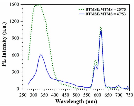 The first important observation is that the intensity of the peaks related to Eu3+ are the same in both cases. This is to be expected because the concentration of Eu3+ depends solely on the concentration of Eu(NO3)3·6H2O introduced into the precursor solution and is independent of the BTMSE/MTMS ratio. Therefore, the amount of Eu3+ deposited on the top surface should be the same, as observed in Figure 13. However, the situation is different for the broad peak in the 275–400 nm region. The intensity of this peak was much higher in the film deposited with a BTMSE/MTMS ratio of 25/75. This indicates that the concentration of Eu2+, which is likely responsible for this emission, increased with the concentration of CH3 groups. It is worth mentioning that Eu2+ aqueous solution in air is known to be unstable, as it can be completely oxidized within 24 h to form Eu3+ [38,62]. Therefore, Eu2+ is not formed in the precursor solution but rather in the already formed film. It forms relatively stable molecules that can only be oxidized by oxygen radicals generated in the ICP oxygen plasma.