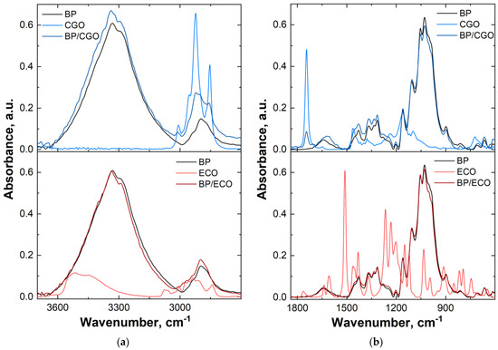 The CGO spectrum shows important bands at 3007, 2953, 2926, and 2854 cm−1. These are assigned to =C-H (cis and trans) and -CH symmetric and asymmetric stretching vibrations from the methyl and methylene groups [31]. In this case, the BP/CGO spectrum shows higher modifications in the 3030–2750 cm−1 region, due to the presence of the CGO on the surface of the paper.