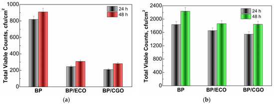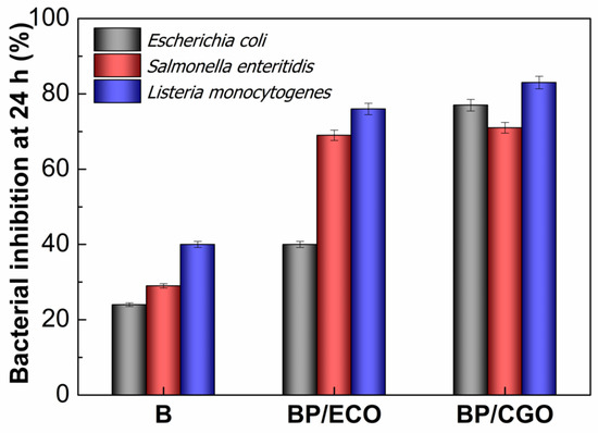 Observing the results from Figure 4, we can determine that by modifying Kraft paper with vegetable oils, improved bacterial inhibition was observed for both Gram-negative and Gram-positive bacteria at 24 h. The efficiency increased in the order of E. coli < L. monocytogenes < S. enteritidis in the case of BP/ECO (essential clove oil) and in the order of L. monocytogenes < S. enteritidis < E. coli in the case of BP/CGO (cold-pressed grape seed oil). Also, cold-pressed grape seed oil showed greater bacterial inhibition compared to essential clove oil for all bacterial strains tested.