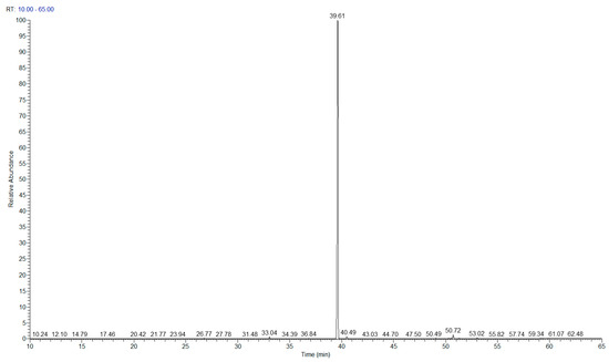 The GC/MS analysis aimed to identify the constituents present in the anise and sage EOs through a comparative elucidation of its mass spectrum with a reference spectrum (NIST Library version 2020). The analysis was performed on a Thermo Scientific Focus GC equipped with an AI/AS 3000 autosampler, coupled with a DSQ II mass detector, and featuring a TraceGOLD TG-624 column (60 m × 0.25 mm × 1.4 μm). The injection volume, at a flow rate of 1.3 mL/min with a split ratio of 1:50, was 1 μL, employing helium as the carrier gas.