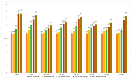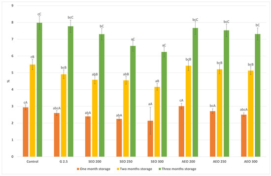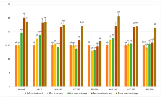The largest increases in TSS were observed in the second month of storage. Significant differences (p < 0.05) were found between the treatments applied throughout storage. Thus, the highest increase in TSS was found in the control variant (17.26%) followed by G 2.5 (16.73%) and AEO 300 (16.45%). The type of EO used and its concentration also influenced the TSS variation during storage. The lowest TSS value was found for the SEO 200 (13.80%) treated variants followed by AEO 200 (14.06%) and AEO 300 (14.06%).