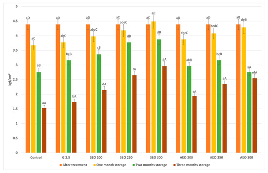 Among the treatments, control (1.529 kg/cm2) and G 2.5 (1.733 kg/cm2) pears exhibited, after 3 months of storage, lower firmness throughout storage, followed by AEO 200 (1.937 kg/cm2) pears. Significant differences (p < 0.05) were also recorded between the applied treatments. The highest firmness was found in SEO 300 (2.957 kg/cm2) followed by SEO 250 (2.651 kg/cm2) and AEO 300 (2.549 kg/cm2). Here, there also were differences between the type and concentrations of EO used.