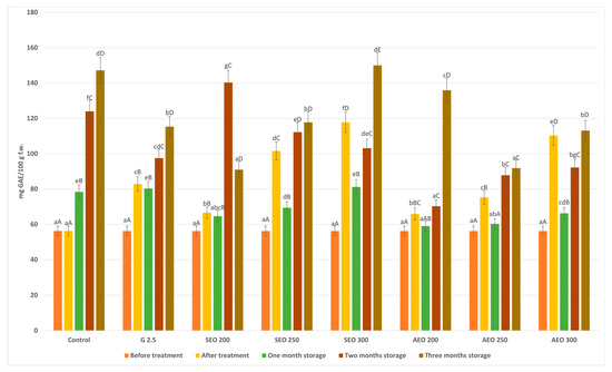 Effects of the applied treatments on total phenolic content (mg GAE/100 g f.w.) during storage for 3 months at 3 ± 1 °C and 80% relative humidity. Bars sharing the same sampling time and denoted by distinct lowercase letters exhibit statistically significant differences, as determined by the least significant difference (LSD) test (p < 0.05). Similarly, bars representing the same treatment across different storage times and marked with varying uppercase letters signify significant differences, as determined by the LSD test (p < 0.05).