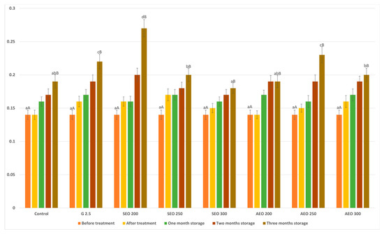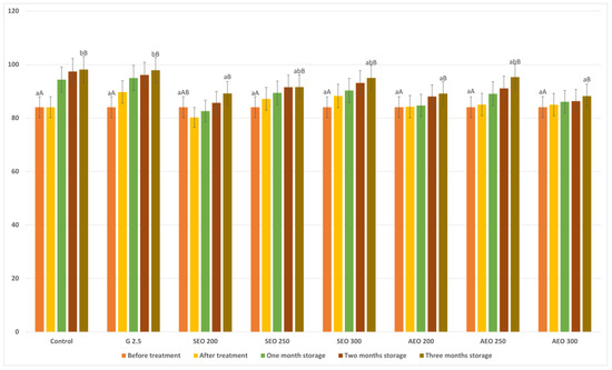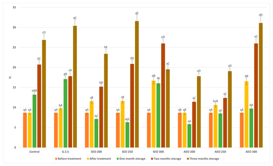 After the first month of storage the percentage of free radical neutralization decreased with significant differences (p < 0.05) between variants, except for the control (13.20%) and G 2.5 variants (17.09%). In the last 2 months of storage, the percentage of free radical neutralization increased significantly, especially in the SEO treated variants except SEO 300. The highest percentage of free radical neutralization at the end of storage was found in SEO 250 (31.59%) and AEO 300 (31.11%). The lower concentrations of EO used resulted in a lower percentage of free radical neutralization even than the control (26.87%) and the G 2.5 variant (30.41%). An exception was found in the SEO 300 variant where the percentage of the neutralization of free radicals presented lower values than the SEO variants with lower concentrations (19.54%).