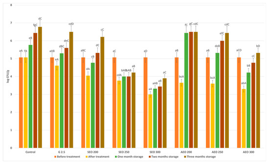 The control and G 2.5 groups exhibited consistent increases in the total count of aerobic mesophilic bacteria (TAMB) throughout the storage duration. By the end of the storage period, TAMB levels in these groups had doubled in comparison to the EO-treated variations (reaching 6.78 in the control and 3.90 in ESO 300).
