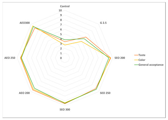 There were significant differences in the volunteer response to both the types and concentrations of the EOs used. In terms of the differences between the types of EO used, the volunteers appreciated the pears treated with sage essential oil more than those treated with aniseed essential oil. As a result of the sensory evaluation, it was determined that the volunteers scored the SEO 300 and SEO 250 variants the highest. As for the aniseed essential oil-treated variants, although the volunteers appreciated the color of the fruit, they gave lower scores in terms of the taste and general acceptance of the pear fruit.
