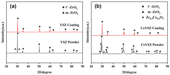 XRD spectra of ceramic powder and as-sprayed coatings. (a) represents YSZ and (b) represents CeYSZ.