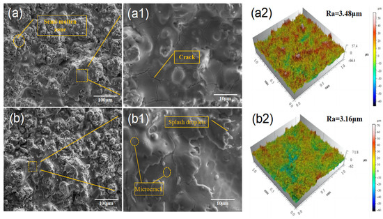 Surface microstructures of the coatings; (a,b) represent CeYSZ and YSZ, respectively, while (a1,b1) are the high magnification views of CeYSZ and YSZ, and (a2,b2) are roughness measurement results of YSZ coating and CeYSZ coating, respectively.