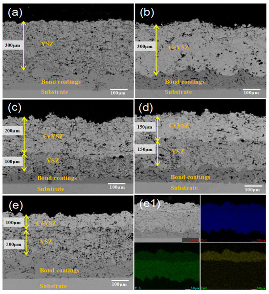 Cross-sectional microstructures of various TBCs produced by APS. (a) TBC-1 (YSZ), (b) TBC-2 (CeYSZ), (c) TBC-3 with a layer ratio of YSZ:CeYSZ = 1:2, (d) TBC-4 with a layer ratio of YSZ:CeYSZ = 1:1, (e) TBC-5 with a layer ratio of YSZ:CeYSZ = 2:1. (e1) represents the EDS (energy-dispersive spectroscopy) mapping results for TBC-5.