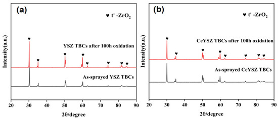 XRD spectra of the coatings after 100 h of oxidation, where (a) represents YSZ and (b) represents CeYSZ.