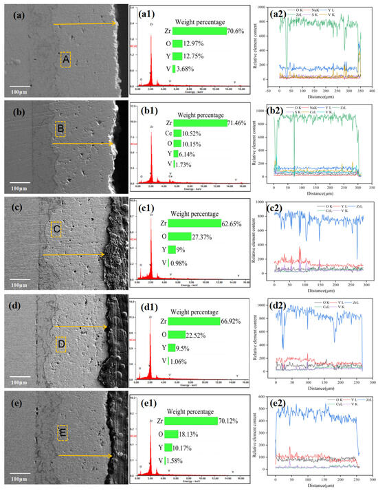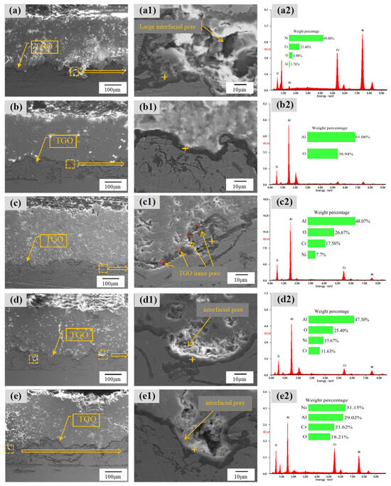 Cross-sectional scanning electron microscopy (SEM) images of (a) TBC-1, (b) TBC-2, (c) TBC-3, (d) TBC-4, and (e) TBC-5. The magnified micrographs from the designated rectangular areas in the main images are depicted in (a1–e1). Elemental spectra and compositions from the sites indicated by the “+” symbol in the enlarged images are presented in 319 (a2–e2).