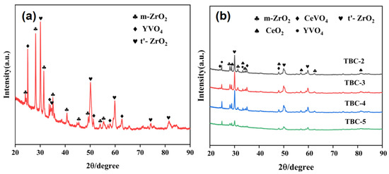 XRD patterns of the coatings after corrosion. (a) corresponds to TBC-1; (b) represents TBC-2, TBC-3, TBC-4, and TBC-5.