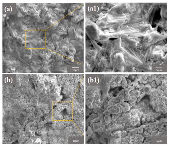 (a,b) depict the microcorrosion morphologies of the YSZ and CeYSZ coatings, respectively. (a1,b1) are magnifications of the boxed areas in (a,b).