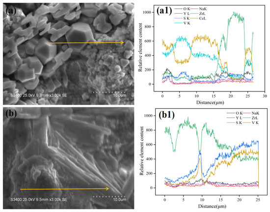 Figure 12 presents the results deduced from line scanning analyses, which aimed at verifying the compositional makeup of the spheroidal particles observed on the surfaces of YSZ and CeYSZ coatings as well as the semi-cuboidal crystals on CeYSZ. As discerned from Figure 12a, the scan line sequentially traverses a semi-cuboidal crystal, a rod-shaped crystal, another semi-cuboidal crystal, a spheroidal particle, and yet another semi-cuboidal crystal. Analyzing the scan results from Figure 12(a1), it is evident that the semi-cuboidal crystal is primarily composed of either CeO2 or CeYO4. Notably, apart from the Ce, there is a detectable amount of V element present at the site of the semi-cuboidal crystal. This suggests that the rod-shaped corrosion products in CeYSZ might be primarily constituted of microrod-shaped YVO4, forming a backbone structure. The spaces within this framework are likely filled and intertwined with semi-cuboidal CeO2 or CeYO4, thus resulting in a chain-like corrosion product amalgamation of CeO2, CeYO4, and YVO4. Within the region where spheroidal particles are densely packed between 20 and 25 μm, all elements except Zr are present in trace amounts. XRD analyses corroborate that the aggregated spheroidal corrosion products of CeYSZ post-corrosion are m-ZrO2. Turning attention to the YSZ corrosion product micrographs in Figure 12b, the scan line systematically spans through a granular area, a relatively smoother surface, and then onto a smooth cluster. As deduced from Figure 12(b1), the granular region primarily consists of Zr, akin to CeYSZ, suggesting that these granules are m-ZrO2. The intermediary quasi-smooth area manifests the coexistence of Zr, Y, and V. As the scan progresses towards the smooth cluster, the concentration of Zr diminishes, while Y and V exhibit an uptick. In regions where the smooth clusters dominate, the concentration of Y and V surpasses that of Zr. This leads to the deduction that the post-corrosion clustered corrosion products of YSZ coatings, primarily YVO4, encapsulate minor amounts of m-ZrO2. Between the coarse granular m-ZrO2 region and the smooth cluster region lies a semi-smooth transition zone where m-ZrO2 coexists with YVO4. This observation potentially explains why post-corrosion, the YSZ coating surface manifests a markedly higher concentration of m-ZrO2 compared to that of the CeYSZ coating.