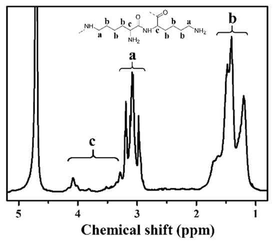 HBPL was synthesized through melt phase polycondensation using an open system reaction, where the water byproduct was evaporated. The structure of HBPL was confirmed via 1HNMR spectroscopy, as shown in Figure 1 (1HNMR (500 MHz, D2O): δ3.29–4.20 (t, 2H), 2.81–3.34 (m, 4H), 1.17–1.71 (m, 12H)). These results demonstrate the successful synthesis of HBPL.