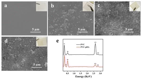 SEM images (insets are the corresponding photographs) of (a) PVC, (b) PVC-pDA, (c) PVC-pDA/HBPL, (d) PVC-pDA-HBPL; and (e) EDS spectrum of pristine PVC and PVC-pDA.
