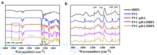The color of the PVC substrate and pDA-HBPL- or pDA/HBPL-deposited samples exhibited noticeable changes, as depicted in the inset of Figure 2. Initially, the PVC membrane possessed a colorless and transparent appearance; however, upon deposition with pDA, it transformed to a light grey shade with slightly reduced transparency. Irrespective of whether pDA/HBPL co-deposition (PVC-pDA/HBPL) or consecutive modification by pDA and HBPL (PVC-pDA-HBPL) was performed, both approaches exhibited a discernible transition towards a light brown hue. This observed color transformation unequivocally signifies the efficacy of pDA deposition, as well as the active involvement of HBPL during DA polymerization for co-deposition (PVC-pDA/HBPL) or successful modification onto PVC-pDA surfaces.