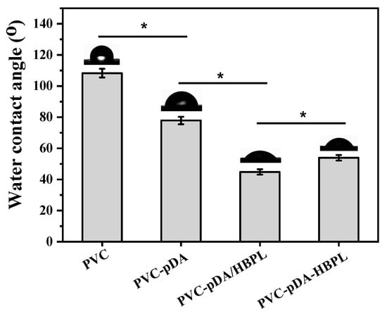 The wettability of the modified PVC films was characterized using water contact angle measurements, yielding an average value derived from the left and right contact angles (Figure 5). The water contact angle of pristine PVC was approximately 108°, indicating its hydrophobic properties. However, this value significantly decreased after surface modification with pDA and was further reduced upon deposition of pDA/HBPL and pDA-HBPL coatings. This observation clearly demonstrates that the introduction of HBPL enhanced the hydrophilicity of pDA coatings. Moreover, it is noteworthy that the surface wettability of pDA/HBPL surpassed that of PVC-pDA-HBPL, which aligns with the deposition density results and suggests that the co-deposition method outperforms successive grafting in terms of improving surface characteristics. The hydrophilic coating achieved through this straightforward treatment method exhibited a significantly enhanced hydrophilicity compared to that obtained via conventional coating [43] or blending techniques [44]. These findings confirm our hypothesis regarding the ability of HBPL to optimize pDA deposition behavior and enhance surface hydrophilicity.