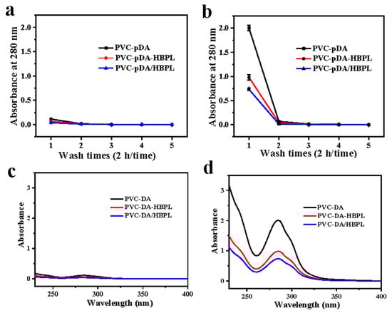 (a,b) Absorbance at 280 nm of eluent from modified samples during repeated elution (2 h/time) with (a) 1.0 M HCl or (b) 1.0 M NaOH solution (n = 4). (c,d) UV–vis spectra of the eluent of modified materials immersed in (c) 1.0 M HCl or (d) 1.0 M NaOH solution for 2 h.