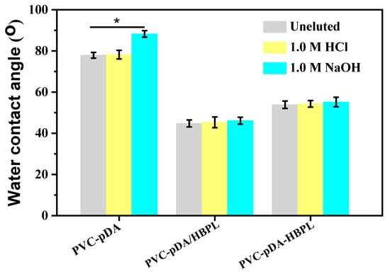 Water contact angles of PVC-pDA, PVC-pDA/HBPL, and PVC-pDA-HBPL after elution with 1.0 M HCl or 1.0 M NaOH solution for 2 h. * indicates significant difference at p < 0.05 level.