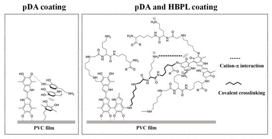 Schematic representation of interactions on PVC films with pDA and pDA/HBPL coatings.