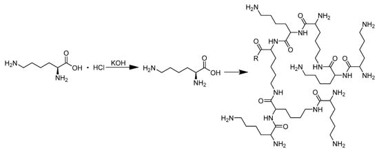 The hyperbranched polylysine utilized in this experiment was synthesized following the previously reported procedure [38] illustrated in Scheme 1. In brief, a mixture of 54.8 g L-lysine hydrochloride and 16.8 g KOH was thoroughly blended in a three-neck flask and subjected to a 2 h reaction with mechanical stirring. Subsequently, the system was heated to 150 °C until the hybrid transformed into a molten state. A catalyst of 7.2 mL Zr(OnBu)4 (equivalent to 3 mol% of the lysine monomer) was added, and the reaction proceeded for 8 h under nitrogen protection with an open state for water evaporation. The resulting brown samples were dissolved in 200 mL methanol, and the KCl byproduct was eliminated through centrifugation at 6500× g for 15 min. Finally, methanol was removed via spin evaporation. The product was redissolved in methanol and dialyzed against water using a dialysis bag with a molecular weight cutoff of 3500 for three days. HBPL was refined through freeze-drying, resulting in a yellowish product with an average molecular weight of approximately 6.2 kDa and a molecular weight distribution index of 1.74, as determined by means of GPC (1260 Infinity II, Agilent, Santa Clara, CA, USA).
