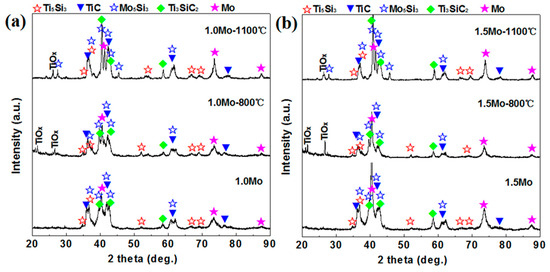 To distinguish the light/gray/dark-gray/black areas of the coating surface, an EPMA analysis of Ti–Si–C–1.0/1.5Mo coating surfaces before and after heat treatment at 800 °C and 1100 °C was performed, and the coating surface EPMA analysis is shown in Figure 3 Usually, a color from red to black represents element content from high to low. As seen, Ti/Si/C/Mo elements are detected in the coating before and after heat treatment. The light region shows red Mo and blue/black Ti/Si/C, so the light region can be defined as an unreacted metal, Mo. This also indicates the insufficient chemical metallurgical reaction during the coat-spraying process. Part of the black region shows black Si and blue/black Ti/C/Mo, so this black region can be defined as unresponsive Si. Part of the black area shows red C and blue/black Ti/Si/Mo, so this black area can be defined as unreacted graphite. The presence of unreacted Si and graphite also indicates that the reaction during coat-spraying is insufficient. The dark-gray area and some gray areas show red/yellow/green Ti/Si/C and blue/black Mo, so these region can be defined as the phase produced by the metallurgical reaction of Ti/Si/C elements. Some gray areas show Mo/Si and blue/black Ti/C in red/yellow/green, so this region can be defined as the phase formed from the metallurgical reaction between Mo and Si. After heat treatment at 800 °C and 1100 °C, the coating micro-cracks tended to heal, the element distribution tended to be homogeneous, and the Mo-Si region increased (indicating that the Mo-Si phase increased), which was mainly because the Ti/Si/C/Mo elements diffused during the heat treating process.
