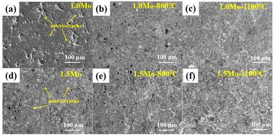 The polished surface morphology of Ti–Si–C–1.0/1.5Mo coatings before and after heat treatment at 800 °C are shown in Figure 2 There are structural characteristics such as micro-cracks, pores, unmelted particles, light/gray/dark-gray/black areas on the surface. Based on the previous research’s results, the deposition and solidification rate during the spraying process were fast, and the above structural characteristics were easy to form in the coating [31,32]. After 800 °C and 1100 °C heat treatment, the micro-cracks of the Ti–Si–C–1.0/1.5Mo coating showed a tendency to heal.