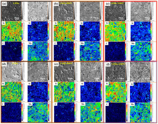 Figure 4 shows the polished cross-sectional morphology and EDS element distribution of the Ti–Si–C–1.0Mo coating after being heat-treated at 1100 °C. It can be seen that the layered structure did not change after heat treatment. Similar to the surface topography features, the coating’s cross-sectional morphology also has structural features such as healed micro-cracks, pores, unmelted particles, and light/gray/dark-gray/black areas. In addition, the boundaries of the light/gray/dark-gray/black areas became blurred, and the particle layer interface was also blurred. Ti/Si/C/Mo elements were distributed in coating layers, and after heat treatment at 1100 °C, the distribution of the elements in the coating was more uniform. According to the above XRD, SEM and EPMA analysis, heat treatment can promote the diffusion of Ti/Si/C/Mo elements, thereby promoting the coating phase’s structure to be denser.