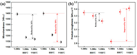 Figure 5 shows the microhardness and fracture toughness of the heat-treated Ti–Si–C–1.0/1.5Mo coating. As seen, the Ti–Si–C–1.0Mo coating average microhardness was HV 1394. After heat treatment at 800 °C, it reduced to HV 1187. After heat treatment at 1100 °C, it reduced to HV 1171, which is 16% lower than that of the raw coating. The Ti–Si–C–1.5Mo coating’s average microhardness was HV 1400. After heat treatment at 800 °C, it reduced to HV 1209. After heat treatment at 1100 °C, it reduced to HV 1145, which is 18% lower than that of the raw coating. This decrease in microhardness is mainly due to the 1100 °C and 800 °C heat treatment increasing the soft phase Ti3SiC2’s formation and lowering the internal stress. The Ti–Si–C–1.0Mo coating fracture toughness is 3.35 MPa·m1/2. After heat treatment at 800 °C, it decreased to 3.303 MPa·m1/2. After heat treatment at 1100 °C, it reduced to 3.227 MPa·m1/2, which is 3% less than that of the raw coating. The Ti–Si–C–1.5Mo coating’s fracture toughness was 2.93 MPa·m1/2. After heat treatment at 800 °C, it increased to 3.362 MPa·m1/2. After heat treatment at 1100 °C, it increased to 3.413 MPa·m1/2, which represents an increase of 16% compared with that of the raw coating. The heat treatment increasing the formation of the ductile phase, Ti3SiC2, microcrack healing, and microstructure densification, resulted in an increased in the coating’s fracture toughness.