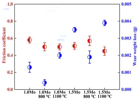 Figure 6 shows the average friction coefficient (calculated based on a stable stage, not containing the running-in period) and wear weight loss of the heated Ti–Si–C–1.0/1.5Mo coatings. The friction coefficient before and after heat treatment changed little, and was 04~0.6. After heat treatment, the wear weight loss of the coating was first reduced and then increased, and the minimum wear weight loss occurred after being heated at 800 °C.