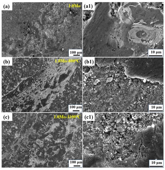 Figure 7 shows the 800 °C and 1100 °C heat-treated coatings’ wear tracks. There were pits, granular abrasive chips and laminar cracks on the wear track surface. After heat treatment, the coating’s granular grinding chips and dark-gray areas increased, and there were more fatigue cracks, which indicated that the wear characteristics of the coating changed. For the heated Ti–Si–C–1.0Mo composite coating at 1100 °C, the abrasive chips and dark-gray areas further increased, and the fatigue cracks became more obvious.