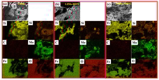 Figure 8 shows the distribution of EDS elements in the wear track of the heated Ti–Si–C–1.0Mo coating. The Ti/Si/C/Mo elements were detected, and the Fe and O elements were also detected (mainly corresponding to the dark gray area). The presence of the Fe element indicates that the friction pair material was transferred during friction, which is related to its relatively low hardness. The appearance of the O element indicates that tribo-oxidation occurred during friction, which is caused by the flash temperature generated during friction. It can be determined that the wear mechanism was abrasive wear, coupled with adhesive wear and friction oxidation wear according to the above analysis.