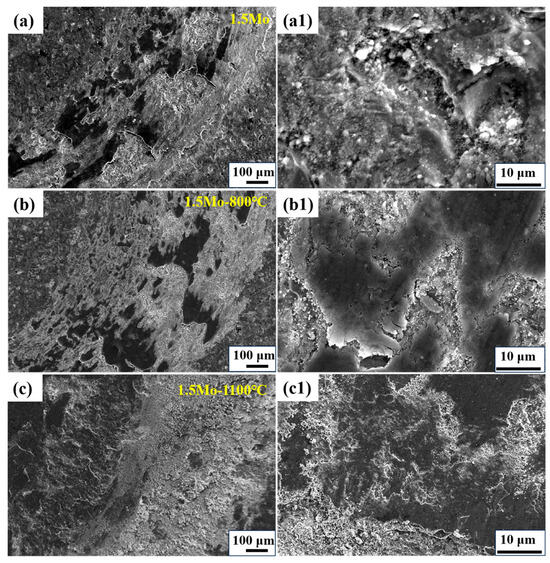 Wear track morphology of Ti–Si–C–1.5Mo coating after being heated at 800 °C and 1100 °C: (a) 1.5Mo, (b) 1.5Mo–800 °C, and (c) 1.5Mo–1100 °C; (a1) enlarged view of (a), (b1) enlarged view of (b), and (c1) enlarged view of (c).